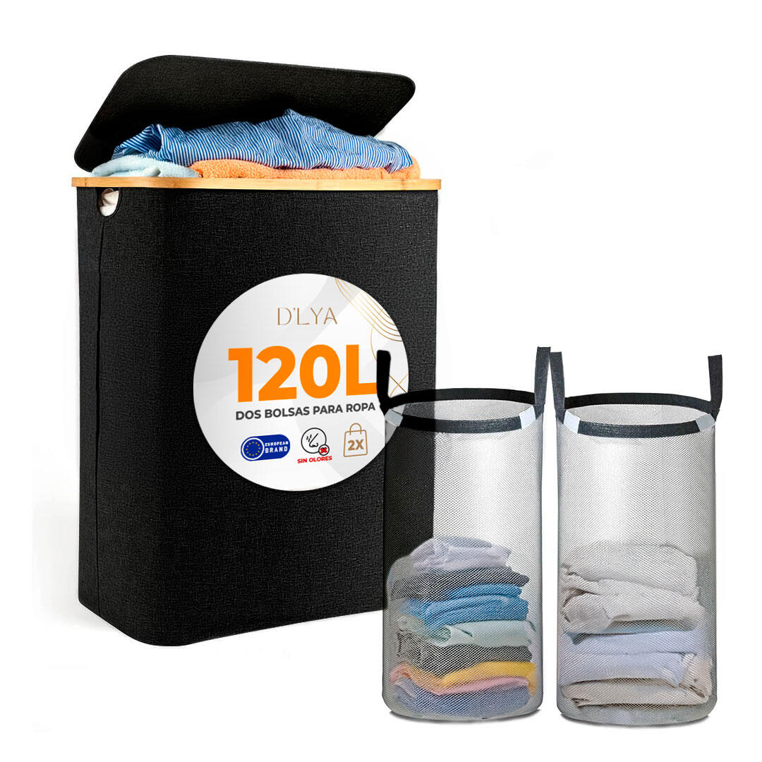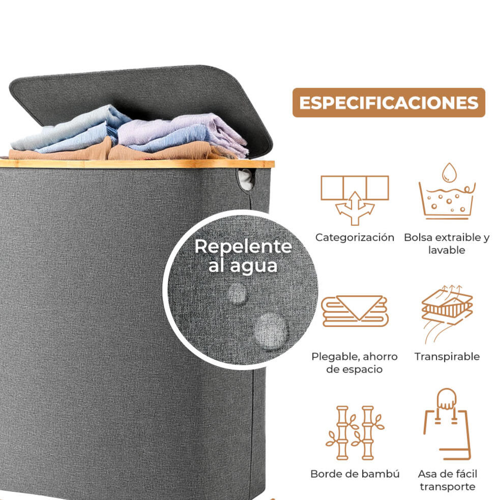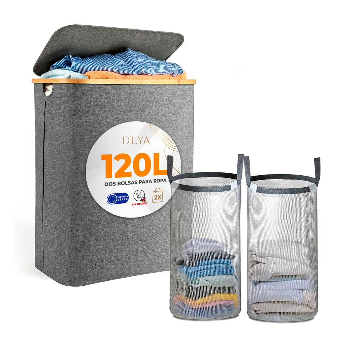 Cesto de ropa sucia plegable tamaño XL (120L), con tapa, asas y doble compartimiento. Incluye bolsas extraíbles y lavables. Liquidación final, envío incluido.