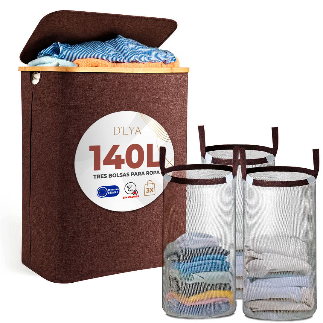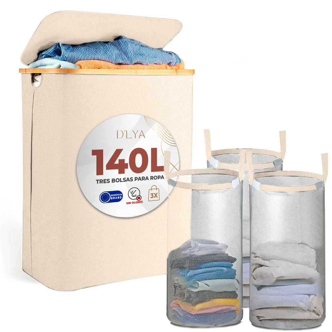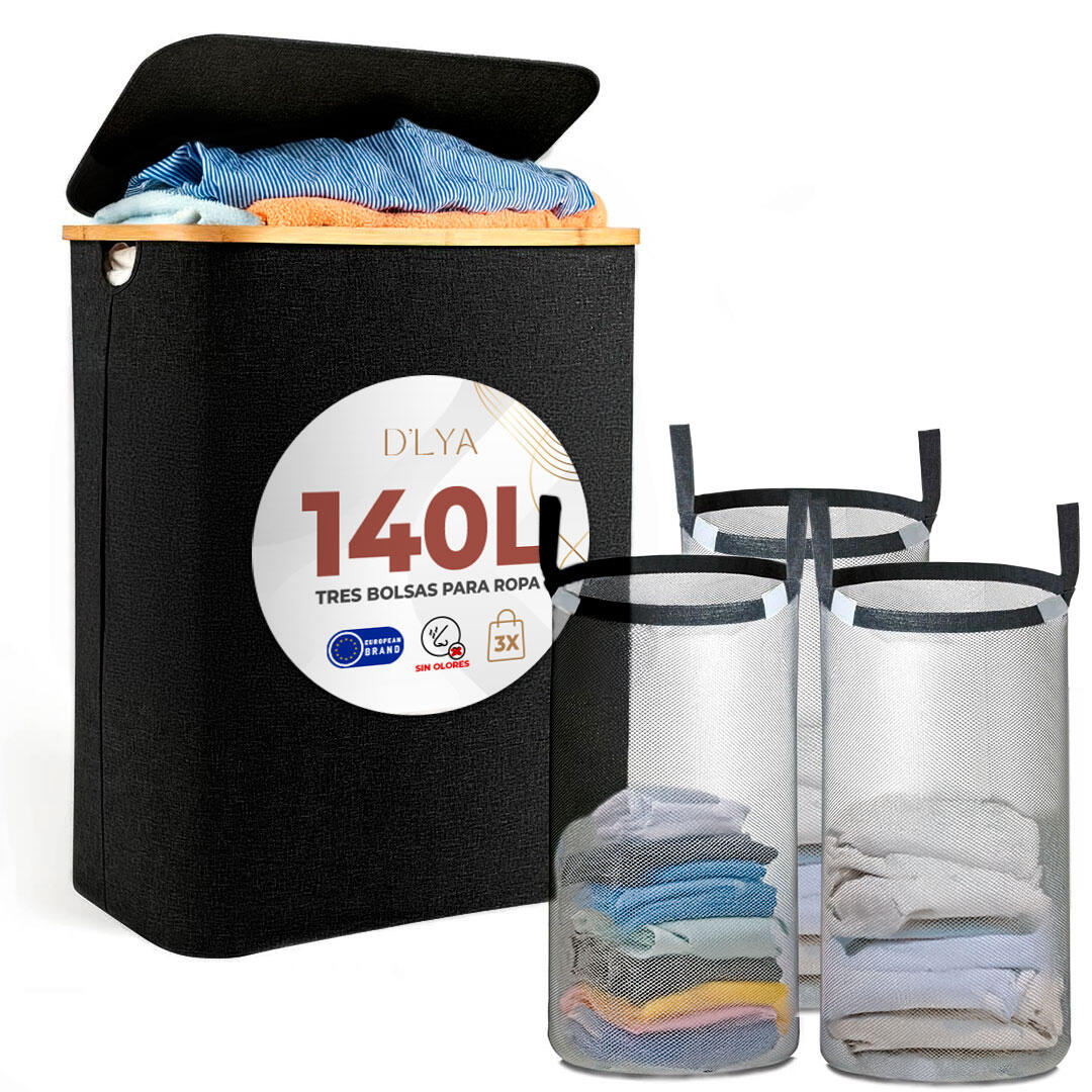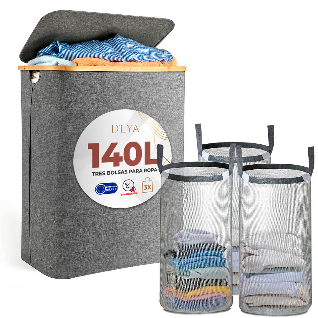 Cesto de ropa sucia plegable tamaño XXL (140L), con tapa, asas y triple compartimiento. Incluye bolsas extraíbles y lavables. Liquidación final, envío incluido.