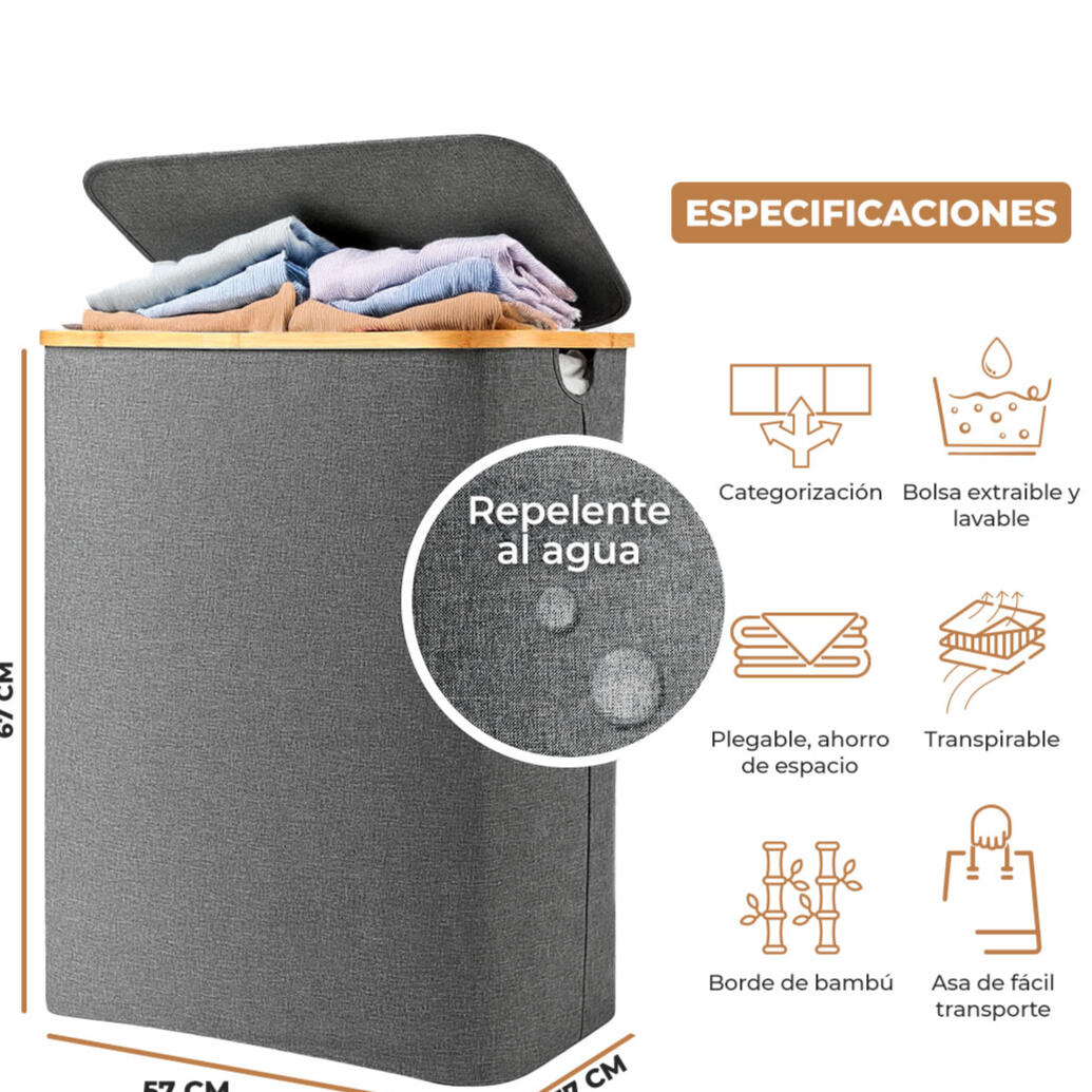 Cesto de ropa sucia plegable tamaño XL (120L), con tapa, asas y doble compartimiento. Incluye bolsas extraíbles y lavables. Liquidación final, envío incluido.